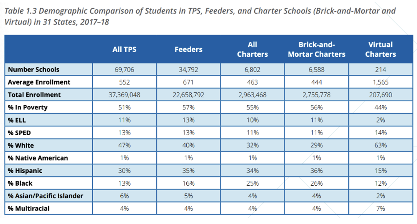 The following table, from CREDO’s National Charter School Study III, compares the profile of students attending charter schools to those in traditional public schools (TPS).