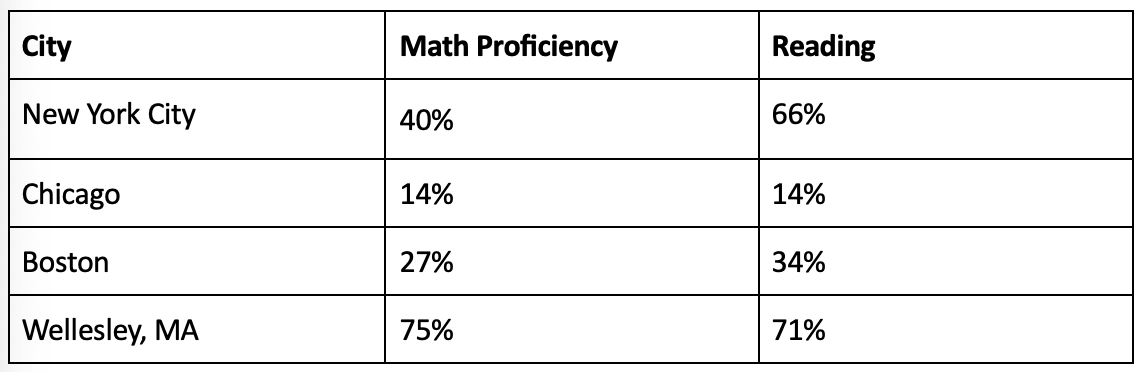 Here are the high school proficiency rates for three large city public school systems, and Wellesley: