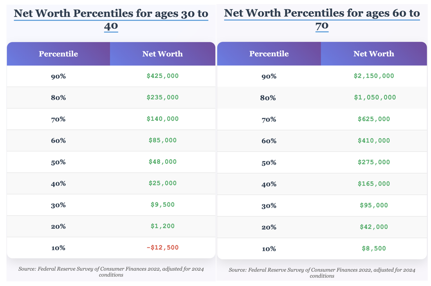 Net worth in the US varies based on several factors, one of which is age. We have provided two snapshots of net worth by percentile of Americans between the ages of 30 and 40, the prime earning years, and ages 60 to 70, which is early retirement age. While net worth increases on average over this period, 50% of those between 30 and 40 have accumulated very little net worth at $48,000 or less. As for the early-retirement-age group, 50% have accumulated less than $275,000, which is insufficient to ensure a financially secure retirement.