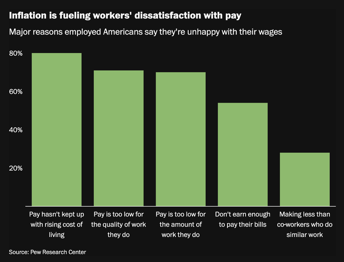 A second indicator is wage growth in relation to inflation and cost of living. The Washington Post wrote, based on a 2024 report by the Pew Research Center, “Only 30 percent of Americans are satisfied with their pay, compared with 34 percent last year … reflecting the ongoing burden of recent price increases. Most workers who voiced frustration about their pay—80 percent—said it was because their wages hadn’t kept up with the higher costs of living, and more than half said they didn’t earn enough to pay their bills.”